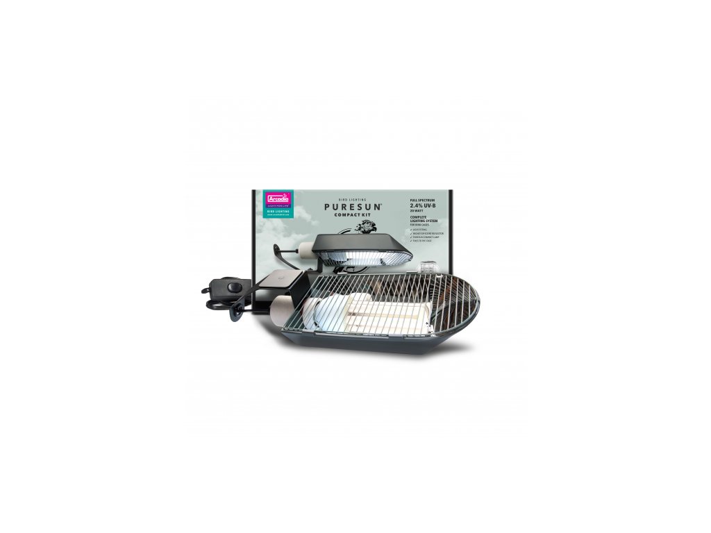 PureSun-CompactKit je standardně dodáván v balení se svítidlem, vysoce efektivním reflektorem, keramickou objímkou se závitem E27, el. přívodním kabelem se spínačem, držáku lampy pro montáž na ptačí klece, ochranné mřížky osvětlení a kompaktní žárovkou 20W Arcadia PureSun Bird Lamp Compact s obsahem 2,4% UVB, 30% UVA.