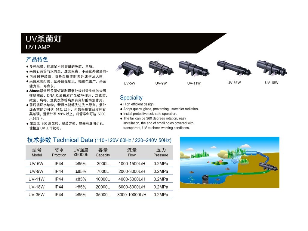 - UV lampa je vhodná na čistenie vody v akváriových nádržiach a vonkajších jazierkach (v zime chráňte UV lampu pred mrazom).